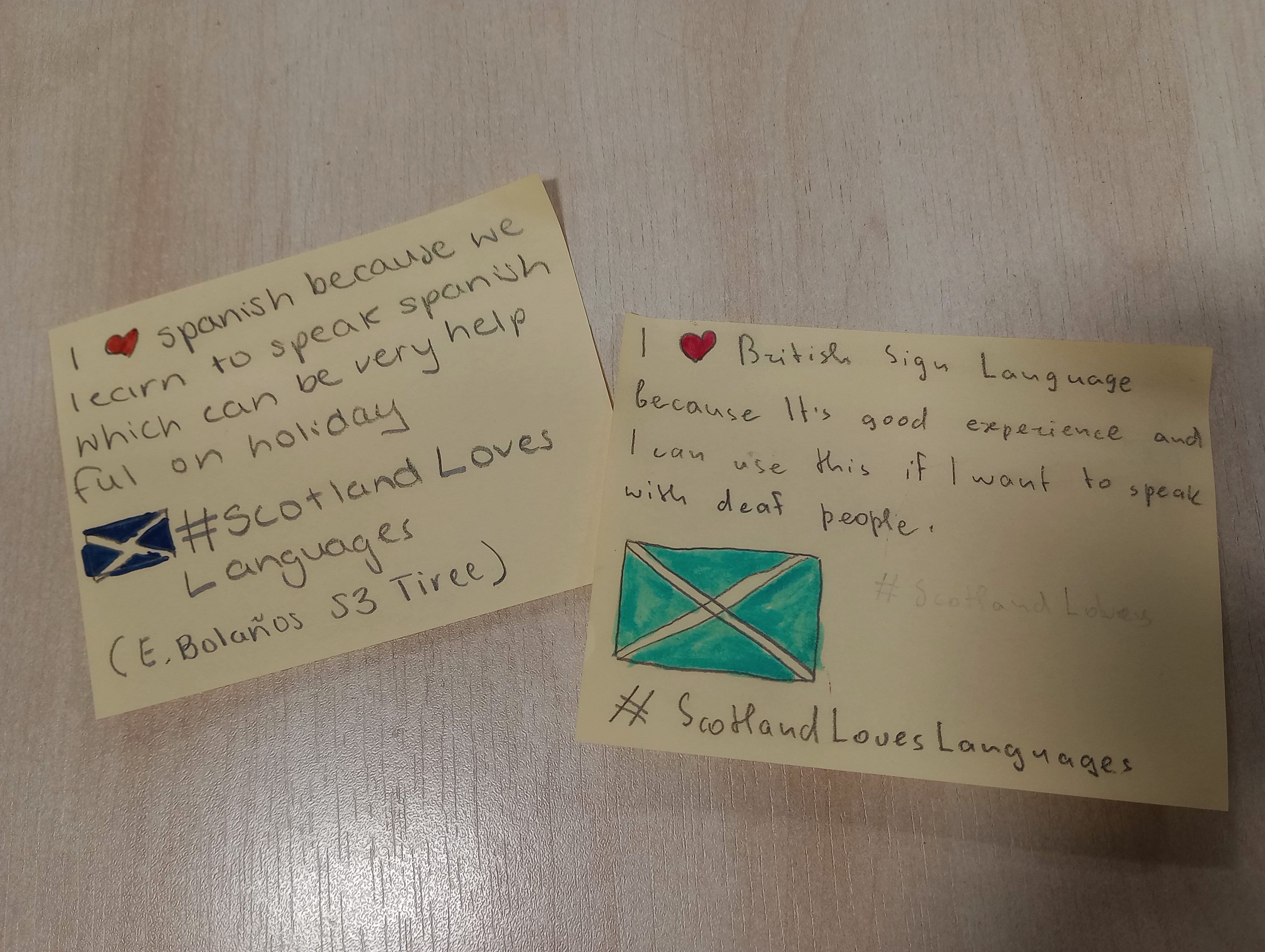 As well as our regular Twitter posts to raise awareness of languages, culture, celebrate success and maintain good health and wellbeing, we did a few other activities this week to celebrate Languages Week Scotland. We asked pupils and teachers to share their opinions on why THEY love languages. We also launched our 5,4,3,2,1 task – this is a great way of checking, brainstorming, creating Spanish and French and also enables active learning, collaborative work and differentiation.